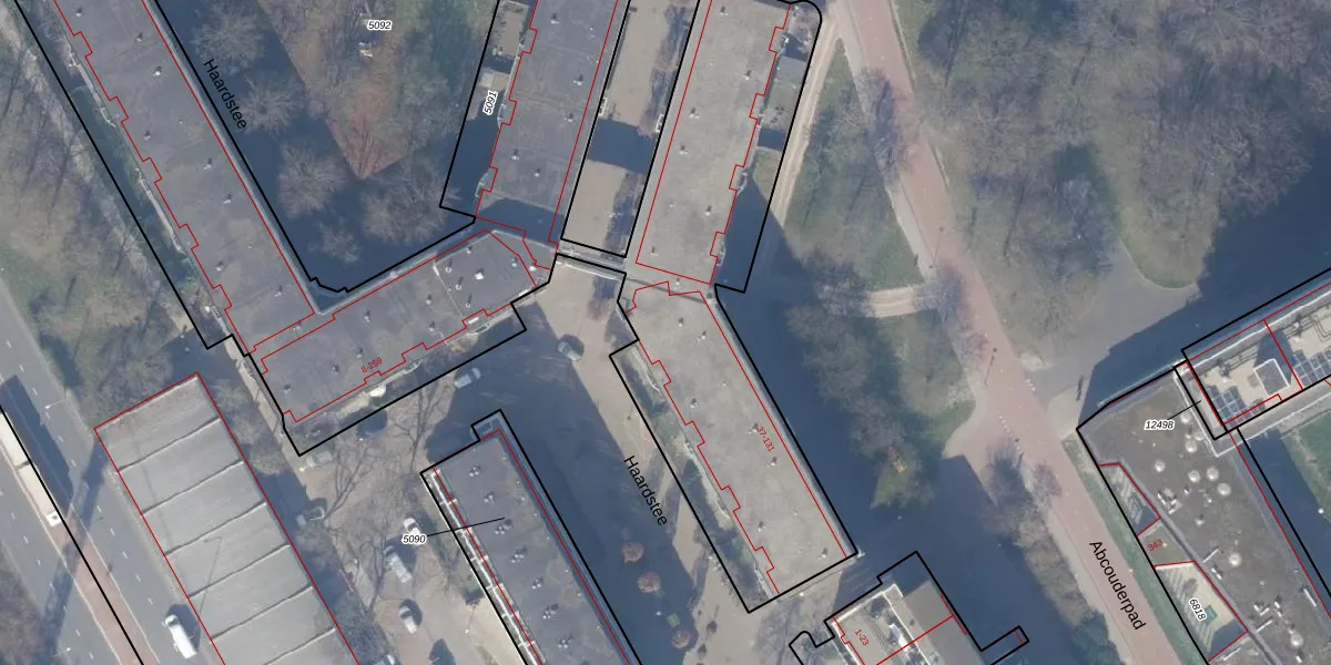 Het perceel waarop Haardstee 56 staat heeft een oppervlakte van 6292 m². Dit is een zeer groot perceel. De perceeloppervlakte wordt geregistreerd door het Kadaster. Gedetailleerde informatie over de maten van dit perceel kunt u vinden in het rapport Kadastrale kaart met maatvoering van Haardstee 56.