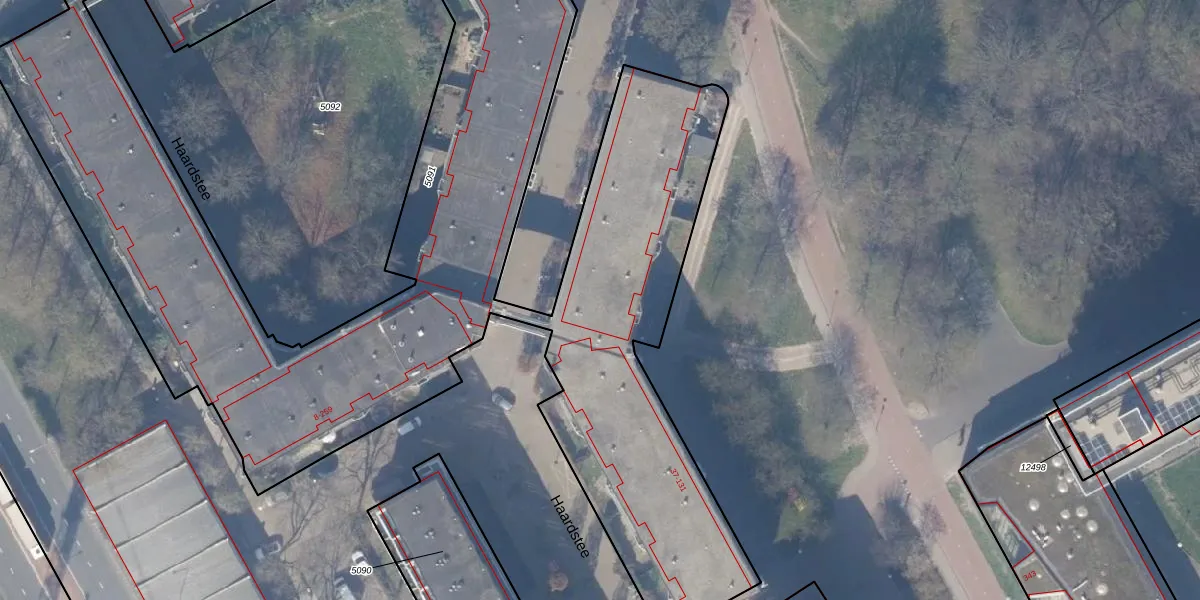 Het perceel waarop Haardstee 65 staat heeft een oppervlakte van 6292 m². Dit is een zeer groot perceel. De perceeloppervlakte wordt geregistreerd door het Kadaster. Gedetailleerde informatie over de maten van dit perceel kunt u vinden in het rapport Kadastrale kaart met maatvoering van Haardstee 65.