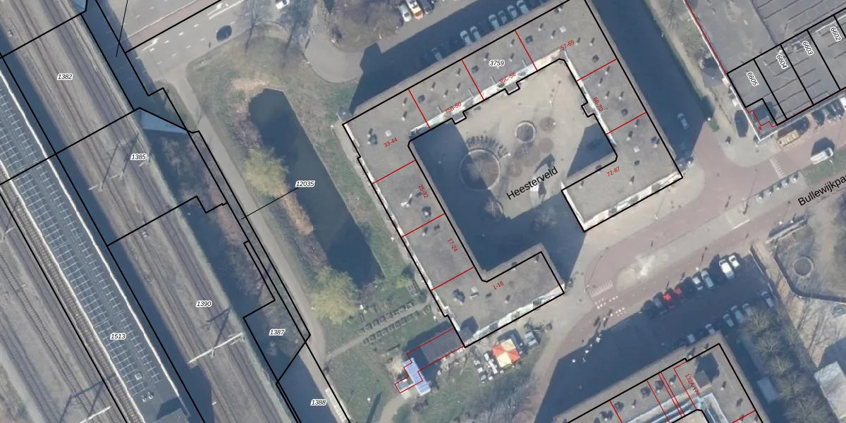 Het perceel waarop Heesterveld 25 staat heeft een oppervlakte van 2085 m². Dit is een zeer groot perceel. De perceeloppervlakte wordt geregistreerd door het Kadaster. Gedetailleerde informatie over de maten van dit perceel kunt u vinden in het rapport Kadastrale kaart met maatvoering van Heesterveld 25.