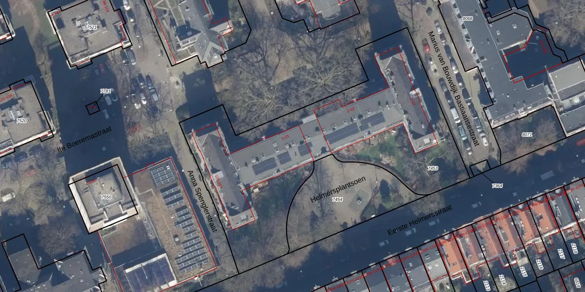 Het perceel waarop Helmersplantsoen 11 staat heeft een oppervlakte van 3295 m². Dit is een zeer groot perceel. De perceeloppervlakte wordt geregistreerd door het Kadaster. Gedetailleerde informatie over de maten van dit perceel kunt u vinden in het rapport Kadastrale kaart met maatvoering van Helmersplantsoen 11.