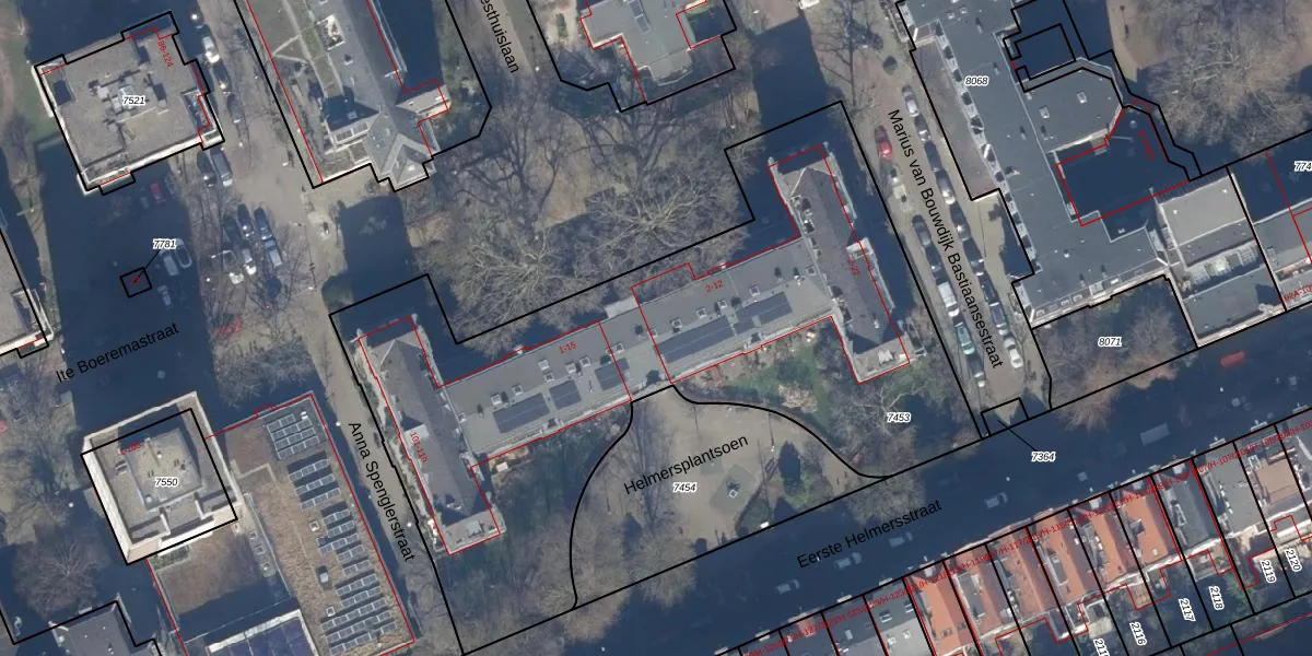 Het perceel waarop Helmersplantsoen 12 staat heeft een oppervlakte van 3295 m². Dit is een zeer groot perceel. De perceeloppervlakte wordt geregistreerd door het Kadaster. Gedetailleerde informatie over de maten van dit perceel kunt u vinden in het rapport Kadastrale kaart met maatvoering van Helmersplantsoen 12.