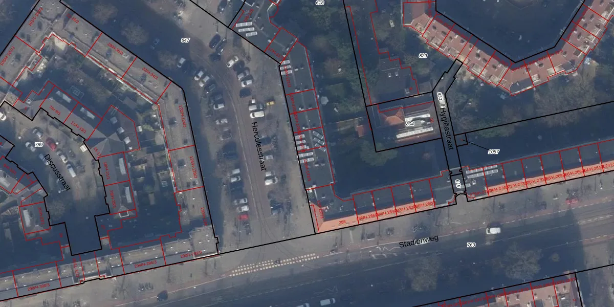 Het perceel waarop Herculesstraat 129-2 staat heeft een oppervlakte van 4961 m². Dit is een zeer groot perceel. De perceeloppervlakte wordt geregistreerd door het Kadaster. Gedetailleerde informatie over de maten van dit perceel kunt u vinden in het rapport Kadastrale kaart met maatvoering van Herculesstraat 129-2.