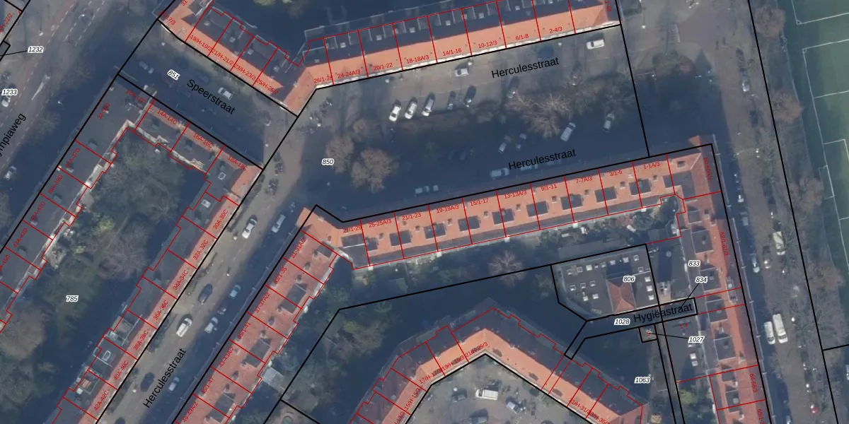 Het perceel waarop Herculesstraat 21-1 staat heeft een oppervlakte van 6807 m². Dit is een zeer groot perceel. De perceeloppervlakte wordt geregistreerd door het Kadaster. Gedetailleerde informatie over de maten van dit perceel kunt u vinden in het rapport Kadastrale kaart met maatvoering van Herculesstraat 21-1.