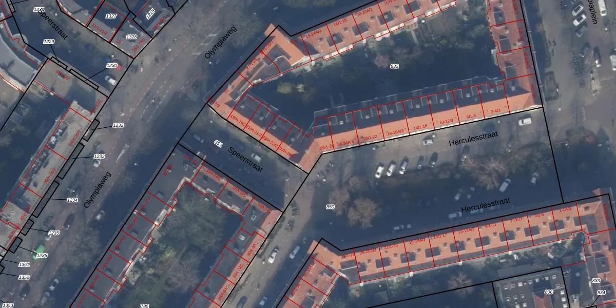 Herculesstraat 28 is gelegen op kadastraal perceel ASD24AC832. Deze kadastrale aanduiding is uniek en wordt gebruikt door het Kadaster om eigendomsrechten en andere zakelijke rechten vast te leggen. Het perceel maakt onderdeel uit van de kadastrale gemeente Amsterdam.