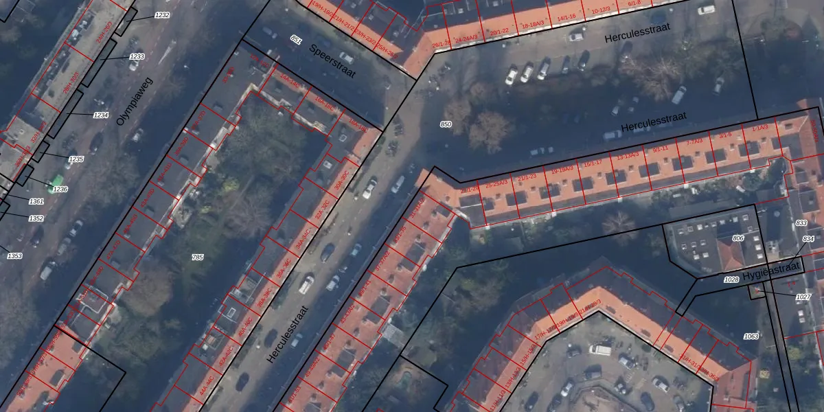 Het perceel waarop Herculesstraat 31-A-2 staat heeft een oppervlakte van 6807 m². Dit is een zeer groot perceel. De perceeloppervlakte wordt geregistreerd door het Kadaster. Gedetailleerde informatie over de maten van dit perceel kunt u vinden in het rapport Kadastrale kaart met maatvoering van Herculesstraat 31-A-2.