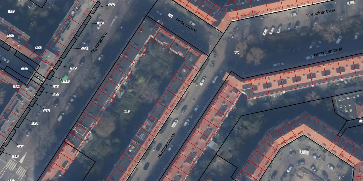 Herculesstraat 32-A is gelegen op kadastraal perceel ASD24AC785. Deze kadastrale aanduiding is uniek en wordt gebruikt door het Kadaster om eigendomsrechten en andere zakelijke rechten vast te leggen. Het perceel maakt onderdeel uit van de kadastrale gemeente Amsterdam.