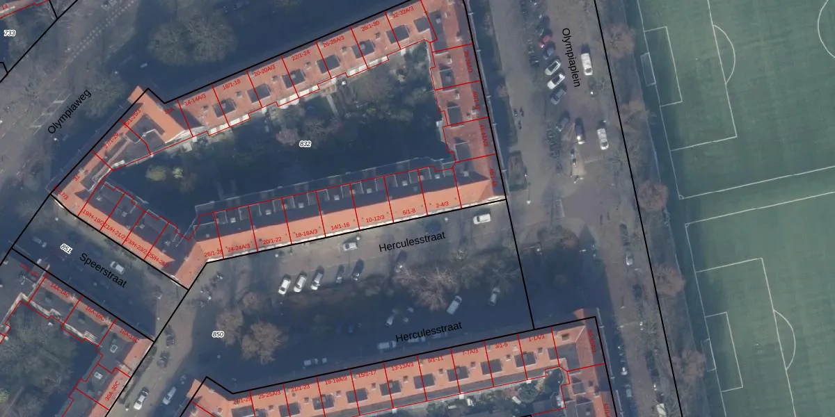 Het perceel waarop Herculesstraat 6-3 staat heeft een oppervlakte van 4379 m². Dit is een zeer groot perceel. De perceeloppervlakte wordt geregistreerd door het Kadaster. Gedetailleerde informatie over de maten van dit perceel kunt u vinden in het rapport Kadastrale kaart met maatvoering van Herculesstraat 6-3.