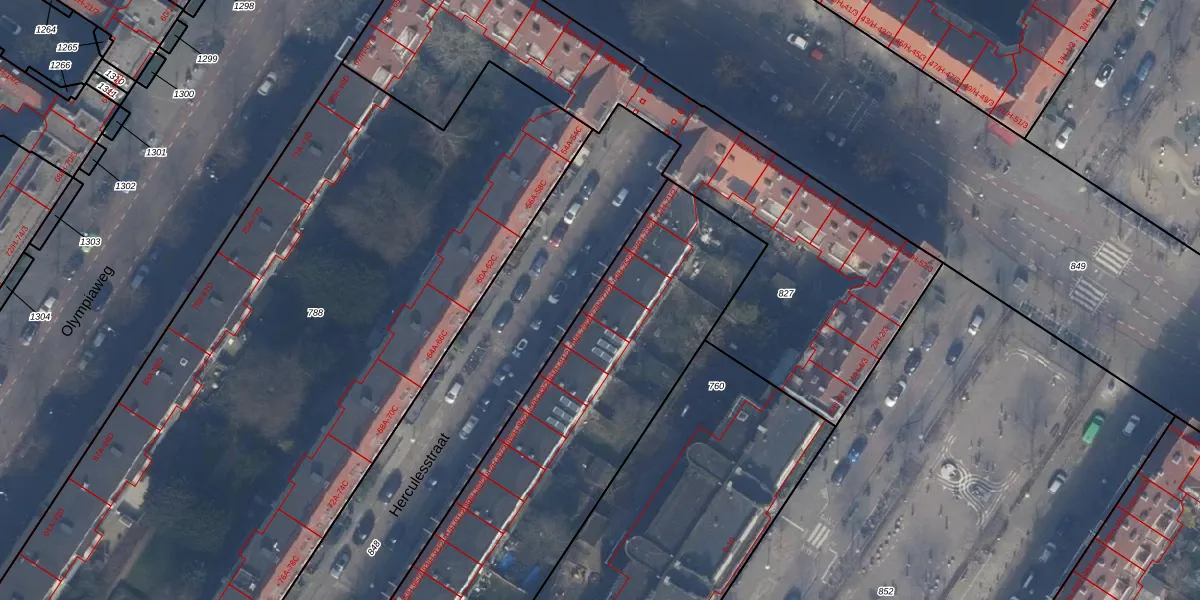 Het perceel waarop Herculesstraat 77-1 staat heeft een oppervlakte van 4961 m². Dit is een zeer groot perceel. De perceeloppervlakte wordt geregistreerd door het Kadaster. Gedetailleerde informatie over de maten van dit perceel kunt u vinden in het rapport Kadastrale kaart met maatvoering van Herculesstraat 77-1.