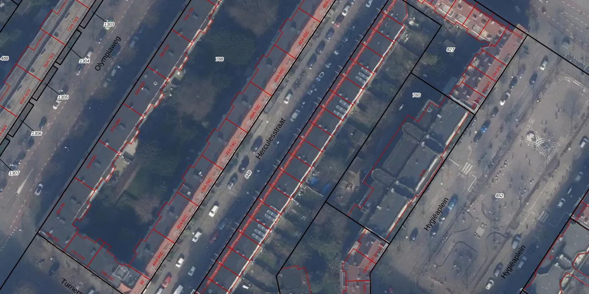 Het perceel waarop Herculesstraat 89-1 staat heeft een oppervlakte van 4961 m². Dit is een zeer groot perceel. De perceeloppervlakte wordt geregistreerd door het Kadaster. Gedetailleerde informatie over de maten van dit perceel kunt u vinden in het rapport Kadastrale kaart met maatvoering van Herculesstraat 89-1.