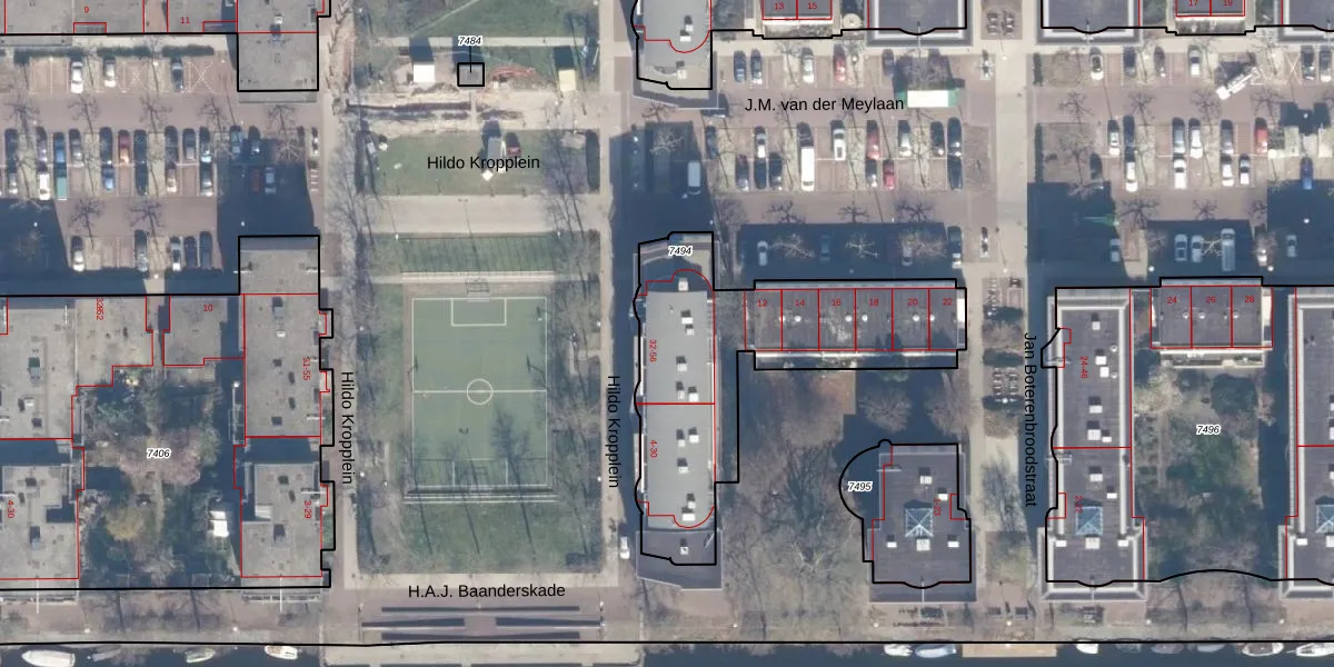 Hildo Kropplein 54 is gelegen op kadastraal perceel ASD02A7494. Deze kadastrale aanduiding is uniek en wordt gebruikt door het Kadaster om eigendomsrechten en andere zakelijke rechten vast te leggen. Het perceel maakt onderdeel uit van de kadastrale gemeente Amsterdam.