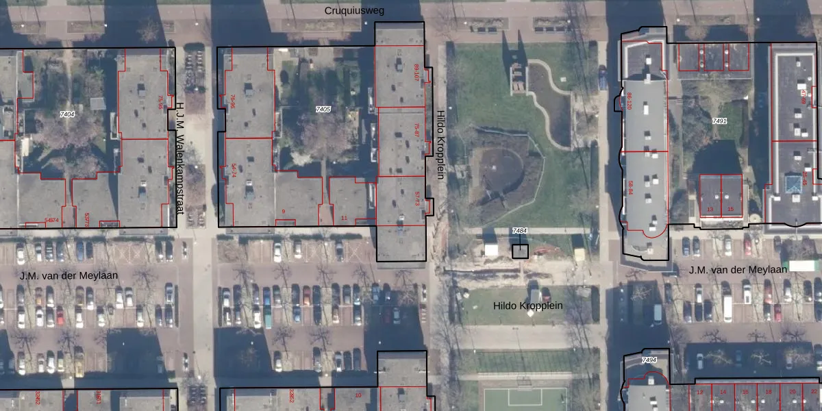 Hildo Kropplein 67 is gelegen op kadastraal perceel ASD02A7405. Deze kadastrale aanduiding is uniek en wordt gebruikt door het Kadaster om eigendomsrechten en andere zakelijke rechten vast te leggen. Het perceel maakt onderdeel uit van de kadastrale gemeente Amsterdam.