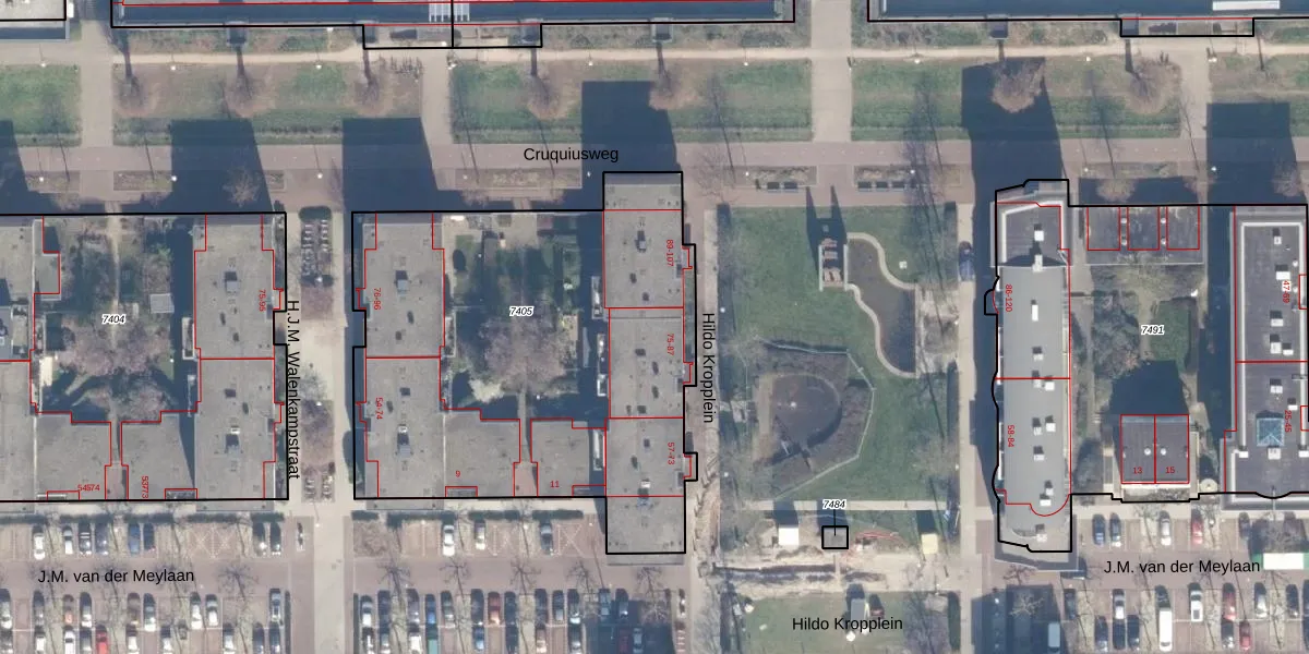 Hildo Kropplein 87 is gelegen op kadastraal perceel ASD02A7405. Deze kadastrale aanduiding is uniek en wordt gebruikt door het Kadaster om eigendomsrechten en andere zakelijke rechten vast te leggen. Het perceel maakt onderdeel uit van de kadastrale gemeente Amsterdam.