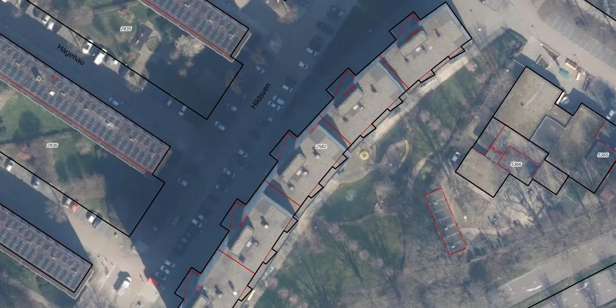 Het perceel waarop Hildsven 190 staat heeft een oppervlakte van 2245 m². Dit is een zeer groot perceel. De perceeloppervlakte wordt geregistreerd door het Kadaster. Gedetailleerde informatie over de maten van dit perceel kunt u vinden in het rapport Kadastrale kaart met maatvoering van Hildsven 190.