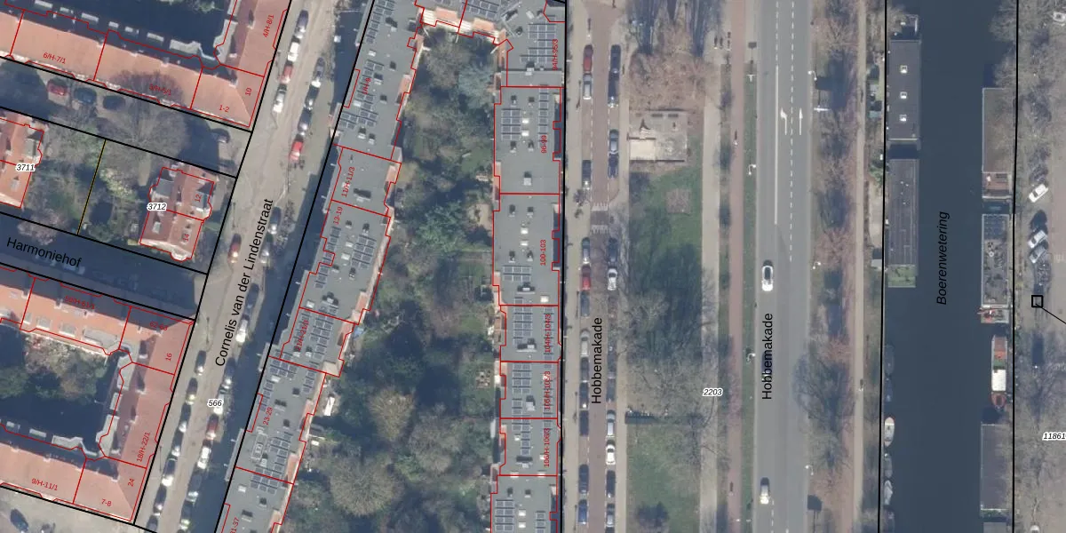 Het perceel waarop Hobbemakade 102-1 staat heeft een oppervlakte van 8900 m². Dit is een zeer groot perceel. De perceeloppervlakte wordt geregistreerd door het Kadaster. Gedetailleerde informatie over de maten van dit perceel kunt u vinden in het rapport Kadastrale kaart met maatvoering van Hobbemakade 102-1.