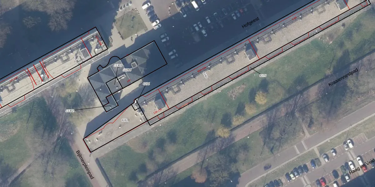 Het perceel waarop Hofgeest 124 staat heeft een oppervlakte van 1815 m². Dit is een zeer groot perceel. De perceeloppervlakte wordt geregistreerd door het Kadaster. Gedetailleerde informatie over de maten van dit perceel kunt u vinden in het rapport Kadastrale kaart met maatvoering van Hofgeest 124.