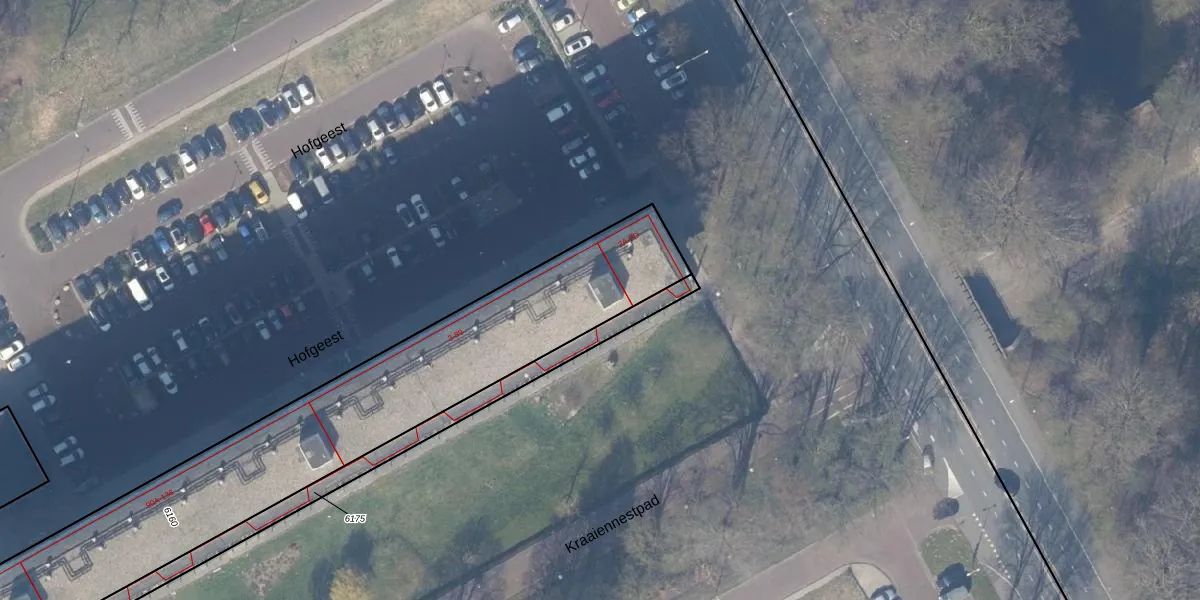 Het perceel waarop Hofgeest 48 staat heeft een oppervlakte van 1815 m². Dit is een zeer groot perceel. De perceeloppervlakte wordt geregistreerd door het Kadaster. Gedetailleerde informatie over de maten van dit perceel kunt u vinden in het rapport Kadastrale kaart met maatvoering van Hofgeest 48.