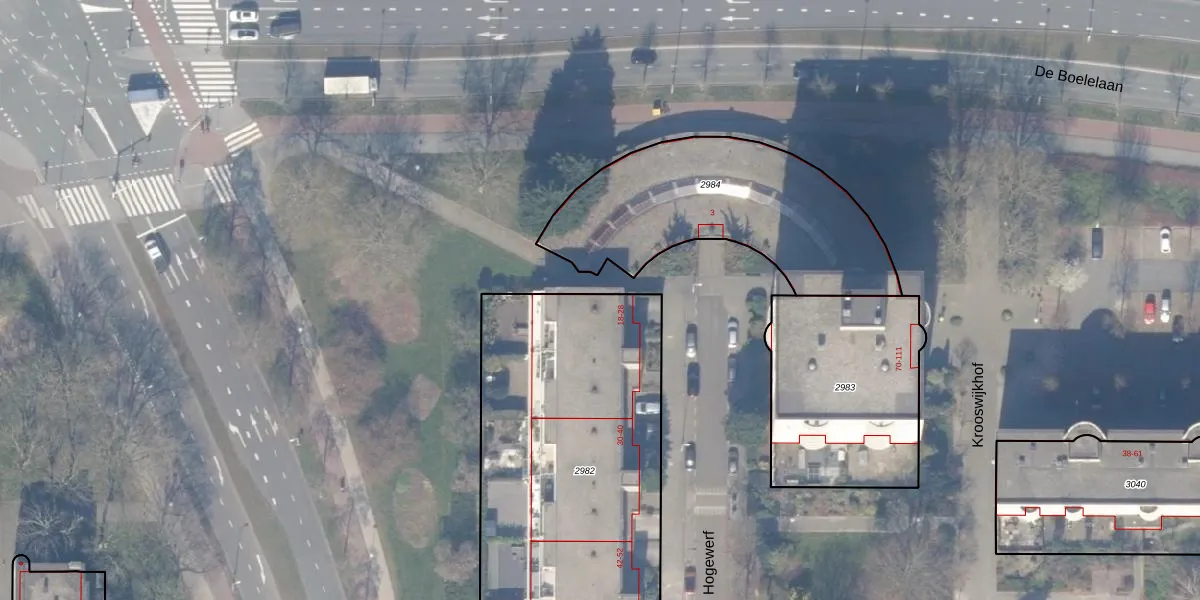 Het perceel waarop Hogewerf 18 staat heeft een oppervlakte van 2470 m². Dit is een zeer groot perceel. De perceeloppervlakte wordt geregistreerd door het Kadaster. Gedetailleerde informatie over de maten van dit perceel kunt u vinden in het rapport Kadastrale kaart met maatvoering van Hogewerf 18.