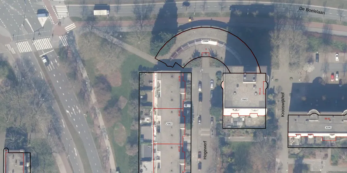 Het perceel waarop Hogewerf 22 staat heeft een oppervlakte van 2470 m². Dit is een zeer groot perceel. De perceeloppervlakte wordt geregistreerd door het Kadaster. Gedetailleerde informatie over de maten van dit perceel kunt u vinden in het rapport Kadastrale kaart met maatvoering van Hogewerf 22.