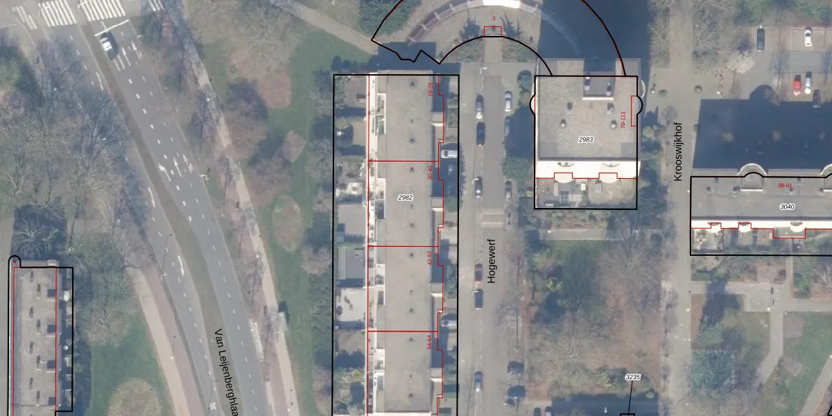 Het perceel waarop Hogewerf 36 staat heeft een oppervlakte van 2470 m². Dit is een zeer groot perceel. De perceeloppervlakte wordt geregistreerd door het Kadaster. Gedetailleerde informatie over de maten van dit perceel kunt u vinden in het rapport Kadastrale kaart met maatvoering van Hogewerf 36.