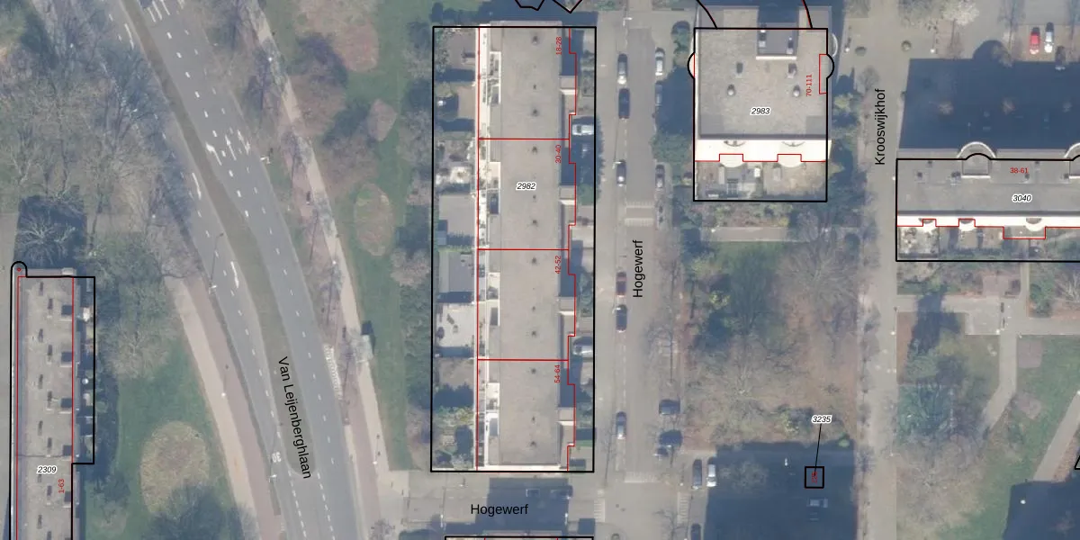 Het perceel waarop Hogewerf 44 staat heeft een oppervlakte van 2470 m². Dit is een zeer groot perceel. De perceeloppervlakte wordt geregistreerd door het Kadaster. Gedetailleerde informatie over de maten van dit perceel kunt u vinden in het rapport Kadastrale kaart met maatvoering van Hogewerf 44.