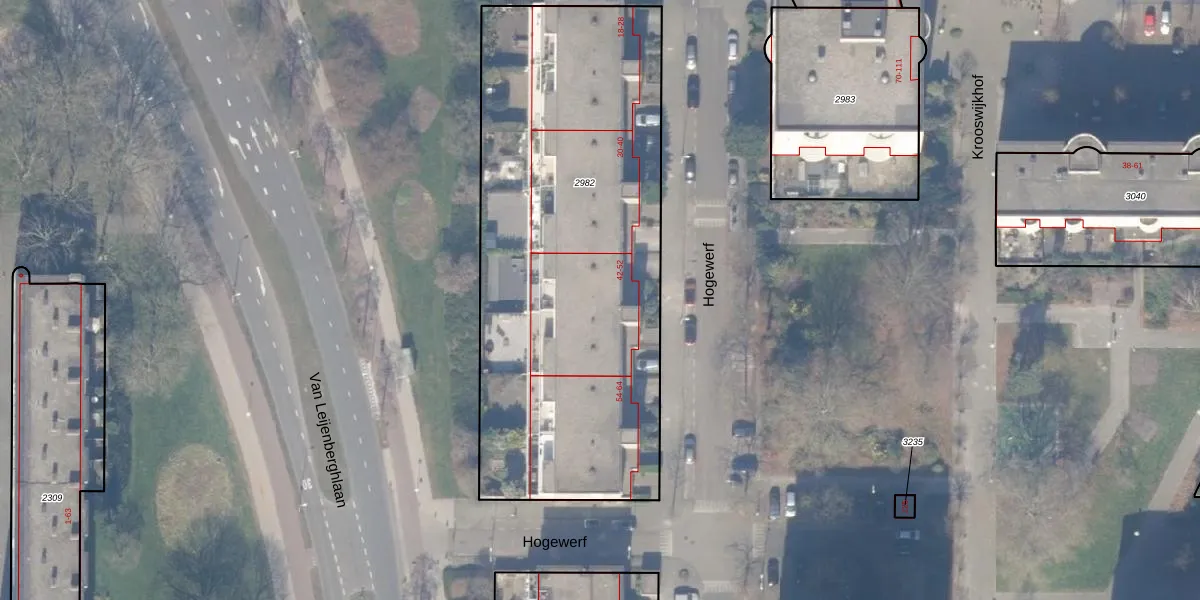 Het perceel waarop Hogewerf 46 staat heeft een oppervlakte van 2470 m². Dit is een zeer groot perceel. De perceeloppervlakte wordt geregistreerd door het Kadaster. Gedetailleerde informatie over de maten van dit perceel kunt u vinden in het rapport Kadastrale kaart met maatvoering van Hogewerf 46.
