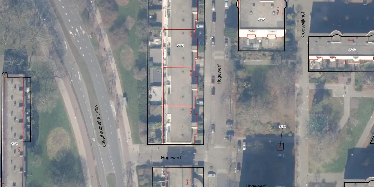 Het perceel waarop Hogewerf 50 staat heeft een oppervlakte van 2470 m². Dit is een zeer groot perceel. De perceeloppervlakte wordt geregistreerd door het Kadaster. Gedetailleerde informatie over de maten van dit perceel kunt u vinden in het rapport Kadastrale kaart met maatvoering van Hogewerf 50.