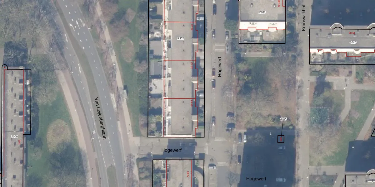 Het perceel waarop Hogewerf 52 staat heeft een oppervlakte van 2470 m². Dit is een zeer groot perceel. De perceeloppervlakte wordt geregistreerd door het Kadaster. Gedetailleerde informatie over de maten van dit perceel kunt u vinden in het rapport Kadastrale kaart met maatvoering van Hogewerf 52.