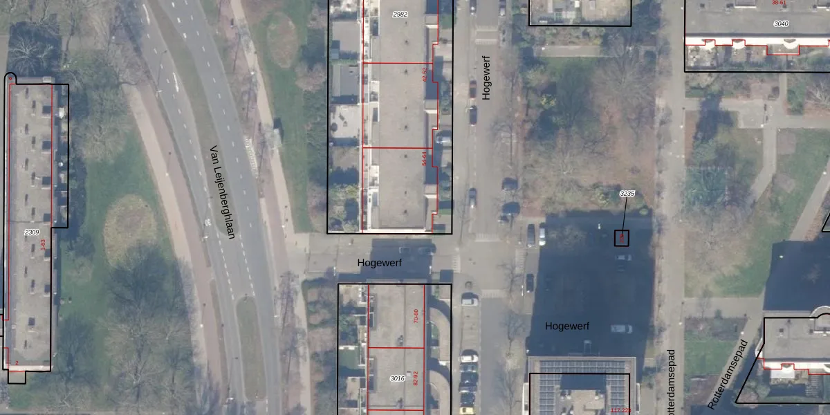 Het perceel waarop Hogewerf 62 staat heeft een oppervlakte van 2470 m². Dit is een zeer groot perceel. De perceeloppervlakte wordt geregistreerd door het Kadaster. Gedetailleerde informatie over de maten van dit perceel kunt u vinden in het rapport Kadastrale kaart met maatvoering van Hogewerf 62.