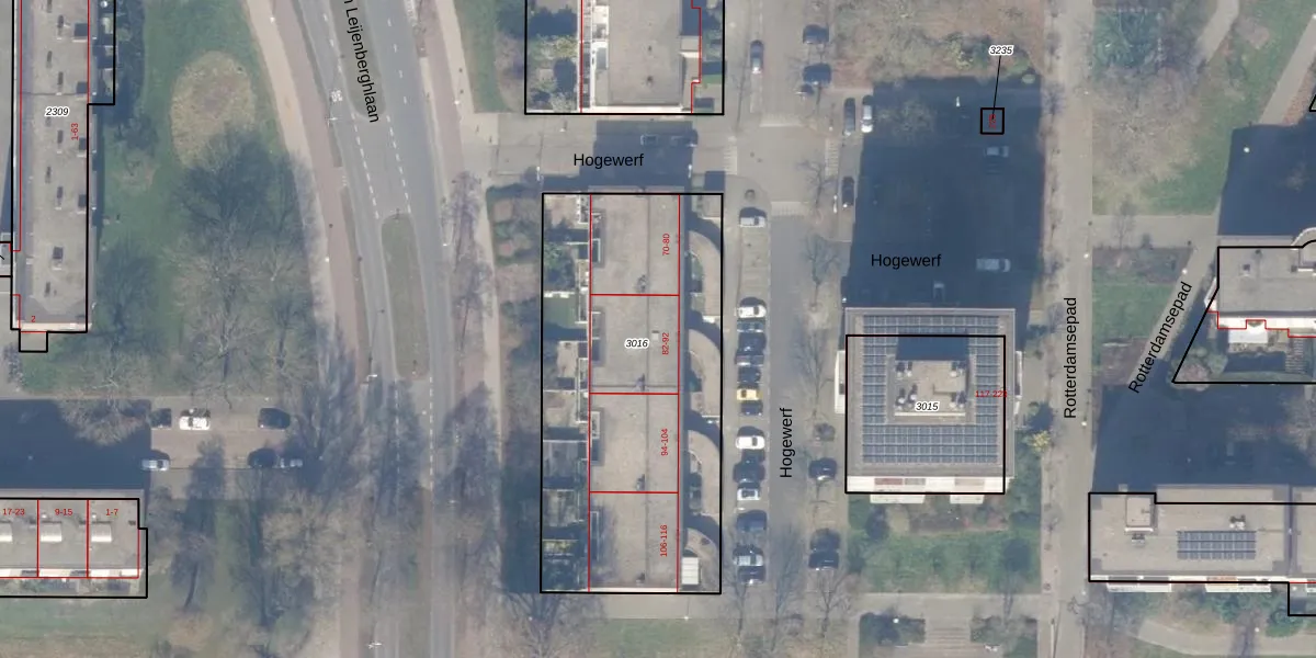 Het perceel waarop Hogewerf 86 staat heeft een oppervlakte van 1670 m². Dit is een zeer groot perceel. De perceeloppervlakte wordt geregistreerd door het Kadaster. Gedetailleerde informatie over de maten van dit perceel kunt u vinden in het rapport Kadastrale kaart met maatvoering van Hogewerf 86.