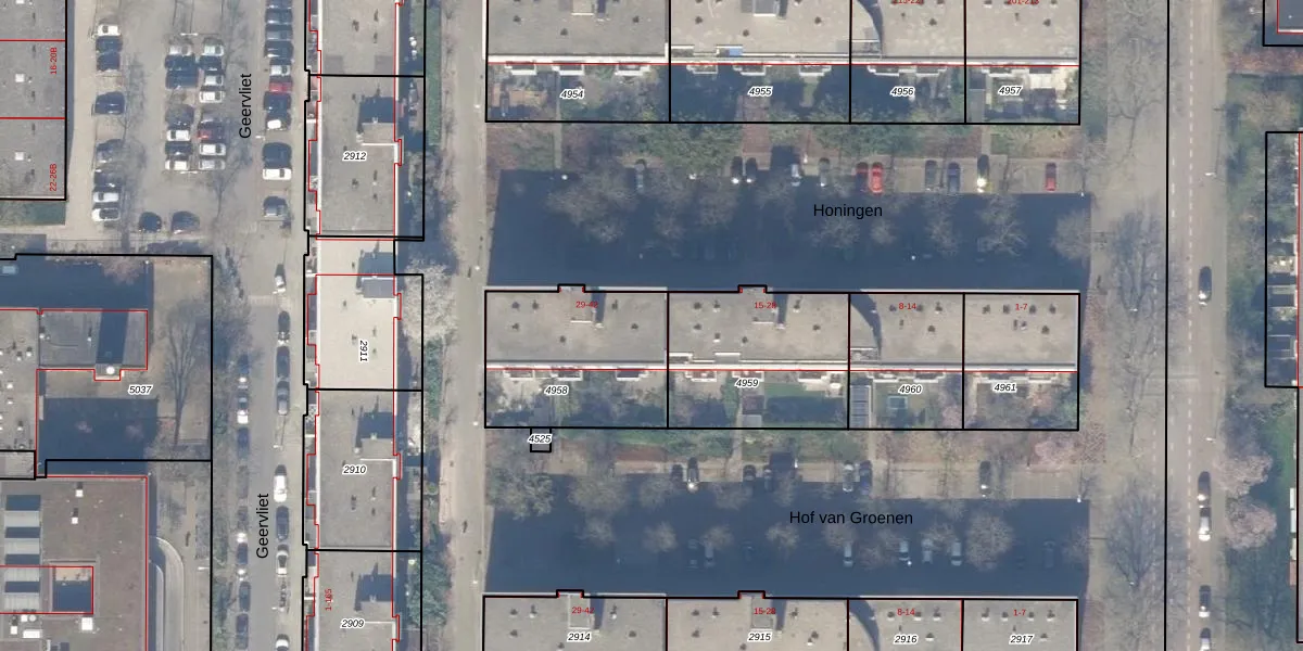 Het perceel waarop Honingen 39 staat heeft een oppervlakte van 590 m². Dit is een groot perceel. De perceeloppervlakte wordt geregistreerd door het Kadaster. Gedetailleerde informatie over de maten van dit perceel kunt u vinden in het rapport Kadastrale kaart met maatvoering van Honingen 39.