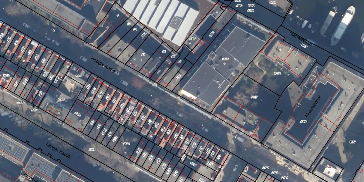 Hoogte Kadijk 39 is gelegen op kadastraal perceel ASD11O2525. Deze kadastrale aanduiding is uniek en wordt gebruikt door het Kadaster om eigendomsrechten en andere zakelijke rechten vast te leggen. Het perceel maakt onderdeel uit van de kadastrale gemeente Amsterdam.