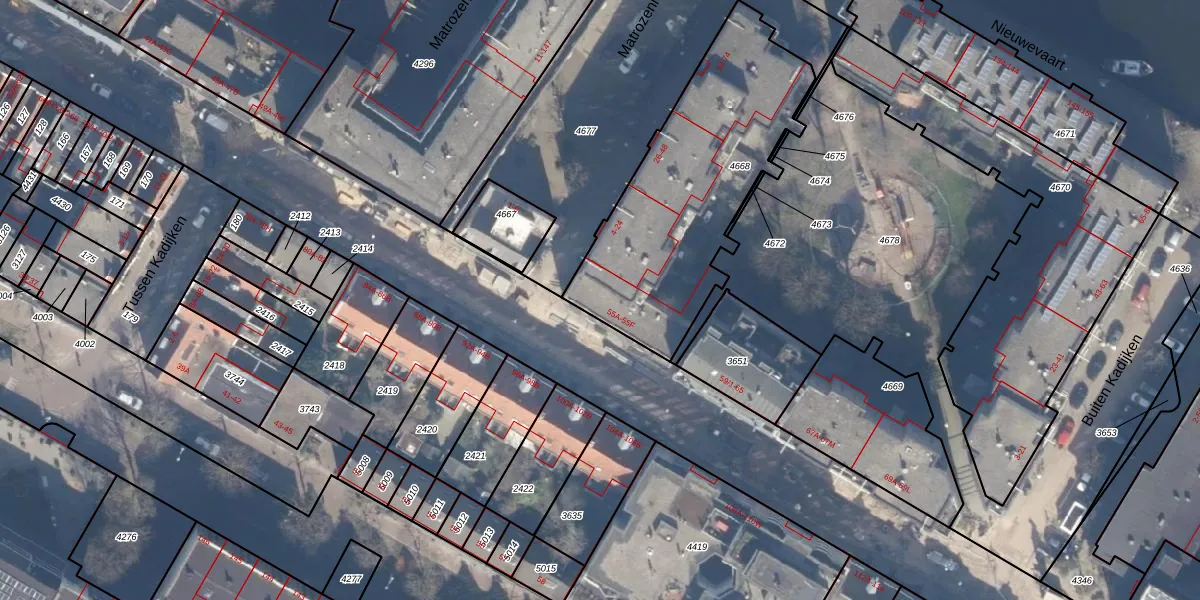 Het perceel waarop Hoogte Kadijk 55-F staat heeft een oppervlakte van 1075 m². Dit is een zeer groot perceel. De perceeloppervlakte wordt geregistreerd door het Kadaster. Gedetailleerde informatie over de maten van dit perceel kunt u vinden in het rapport Kadastrale kaart met maatvoering van Hoogte Kadijk 55-F.
