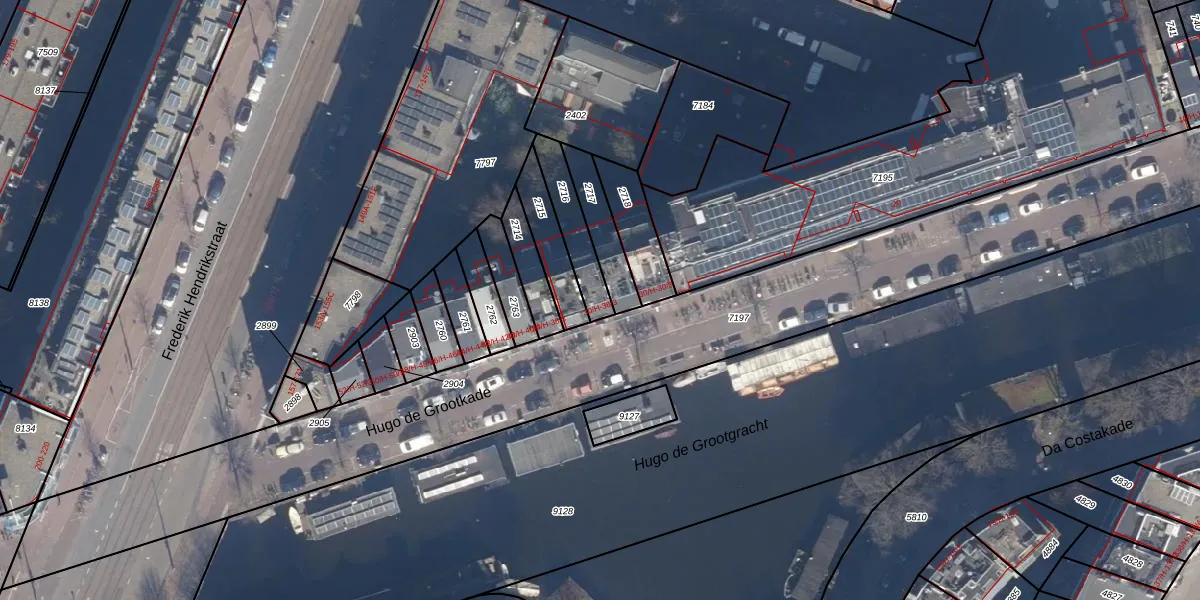 Hugo de Grootkade 34-3 is gelegen op kadastraal perceel ASD13Q2716. Deze kadastrale aanduiding is uniek en wordt gebruikt door het Kadaster om eigendomsrechten en andere zakelijke rechten vast te leggen. Het perceel maakt onderdeel uit van de kadastrale gemeente Amsterdam.