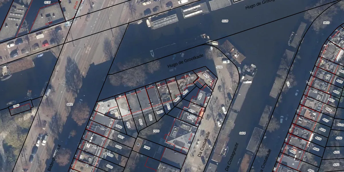 Hugo de Grootkade 5-H is gelegen op kadastraal perceel ASD13Q4673. Deze kadastrale aanduiding is uniek en wordt gebruikt door het Kadaster om eigendomsrechten en andere zakelijke rechten vast te leggen. Het perceel maakt onderdeel uit van de kadastrale gemeente Amsterdam.