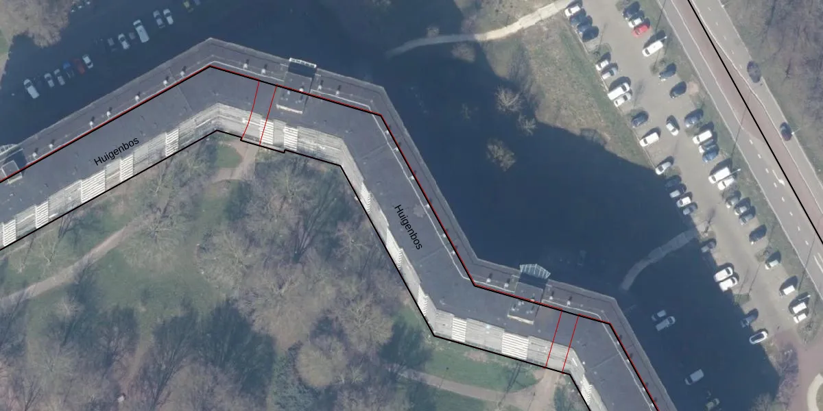 Het perceel waarop Huigenbos 15 staat heeft een oppervlakte van 4959 m². Dit is een zeer groot perceel. De perceeloppervlakte wordt geregistreerd door het Kadaster. Gedetailleerde informatie over de maten van dit perceel kunt u vinden in het rapport Kadastrale kaart met maatvoering van Huigenbos 15.