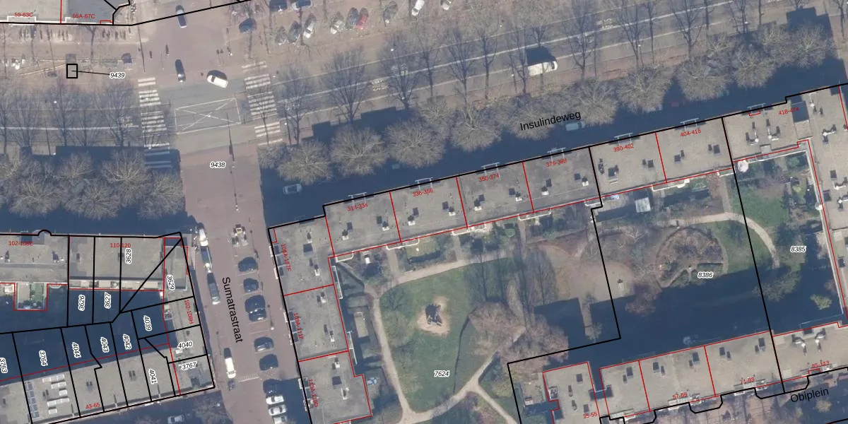 Insulindeweg 340 is gelegen op kadastraal perceel ASD19W7624. Deze kadastrale aanduiding is uniek en wordt gebruikt door het Kadaster om eigendomsrechten en andere zakelijke rechten vast te leggen. Het perceel maakt onderdeel uit van de kadastrale gemeente Amsterdam.
