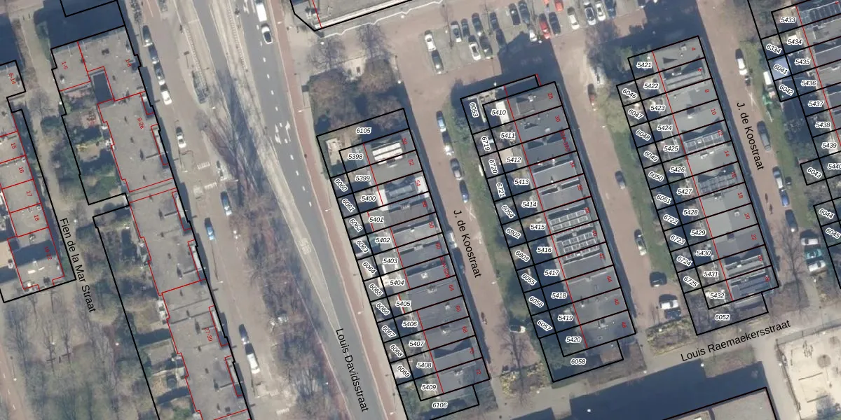 Het perceel waarop J. de Koostraat 56-D staat heeft een oppervlakte van 90 m². Dit is een klein perceel. De perceeloppervlakte wordt geregistreerd door het Kadaster. Gedetailleerde informatie over de maten van dit perceel kunt u vinden in het rapport Kadastrale kaart met maatvoering van J. de Koostraat 56-D.