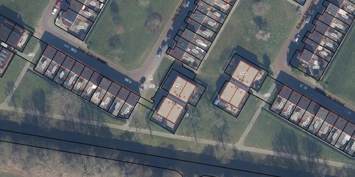 Jaap Edenstraat 13 is gelegen op kadastraal perceel STN02I5047. Deze kadastrale aanduiding is uniek en wordt gebruikt door het Kadaster om eigendomsrechten en andere zakelijke rechten vast te leggen. Het perceel maakt onderdeel uit van de kadastrale gemeente Sloten Noord-Holland.