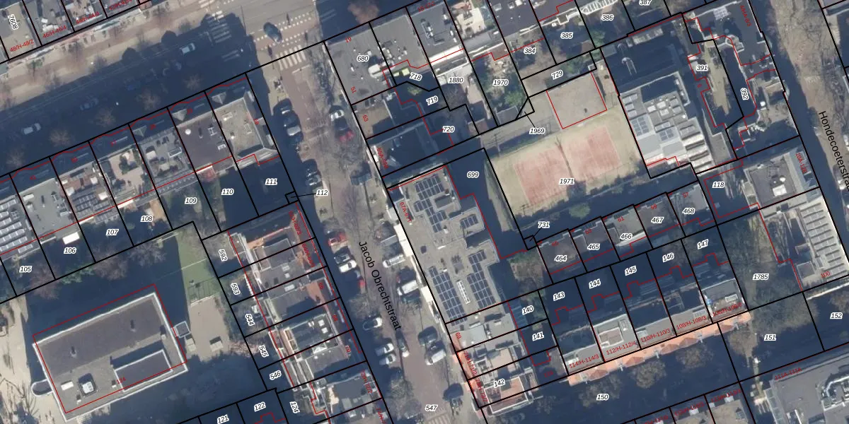 Het perceel waarop Jacob Obrechtstraat 67-E staat heeft een oppervlakte van 913 m². Dit is een groot perceel. De perceeloppervlakte wordt geregistreerd door het Kadaster. Gedetailleerde informatie over de maten van dit perceel kunt u vinden in het rapport Kadastrale kaart met maatvoering van Jacob Obrechtstraat 67-E.