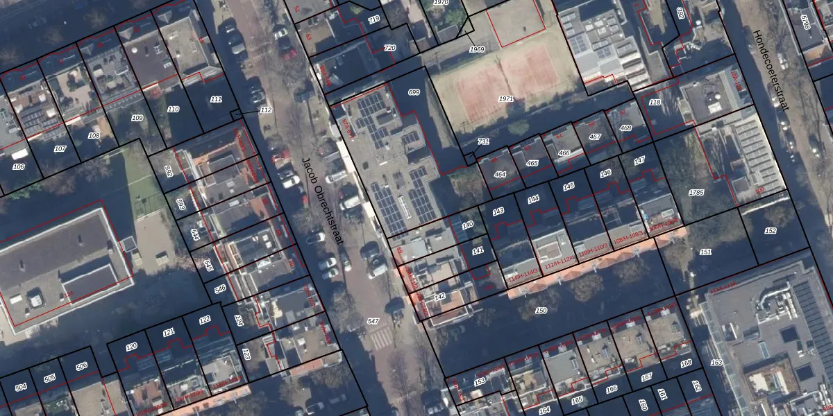Het perceel waarop Jacob Obrechtstraat 67-L staat heeft een oppervlakte van 913 m². Dit is een groot perceel. De perceeloppervlakte wordt geregistreerd door het Kadaster. Gedetailleerde informatie over de maten van dit perceel kunt u vinden in het rapport Kadastrale kaart met maatvoering van Jacob Obrechtstraat 67-L.