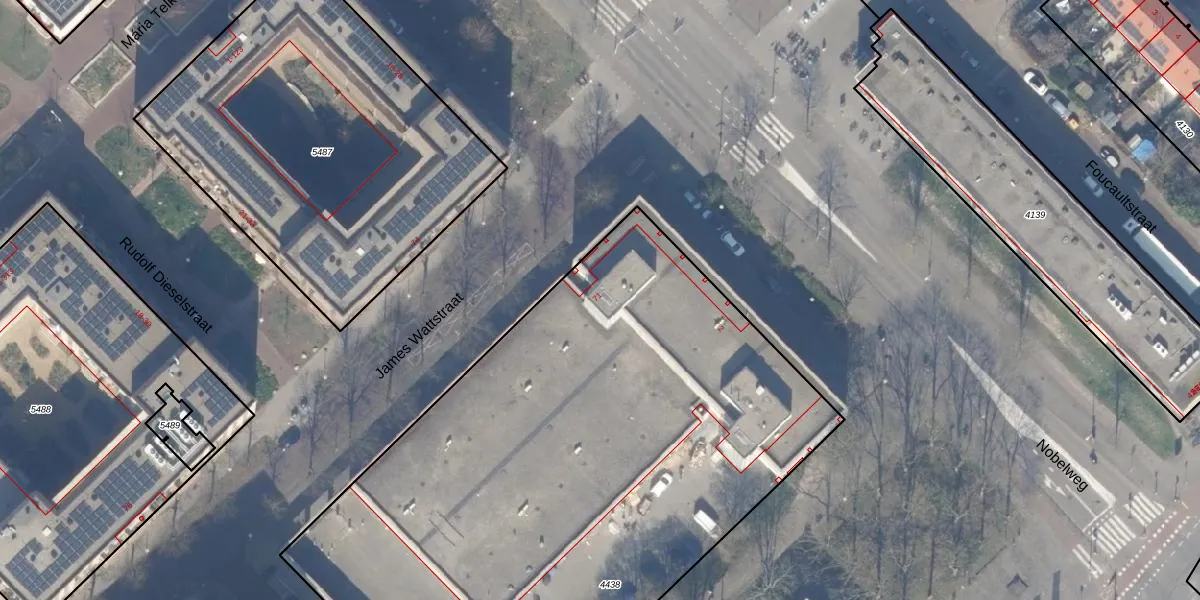 Het perceel waarop James Wattstraat 71 staat heeft een oppervlakte van 4103 m². Dit is een zeer groot perceel. De perceeloppervlakte wordt geregistreerd door het Kadaster. Gedetailleerde informatie over de maten van dit perceel kunt u vinden in het rapport Kadastrale kaart met maatvoering van James Wattstraat 71.