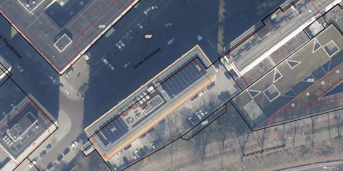 Het perceel waarop James Wattstraat 77-B-1 staat heeft een oppervlakte van 2636 m². Dit is een zeer groot perceel. De perceeloppervlakte wordt geregistreerd door het Kadaster. Gedetailleerde informatie over de maten van dit perceel kunt u vinden in het rapport Kadastrale kaart met maatvoering van James Wattstraat 77-B-1.