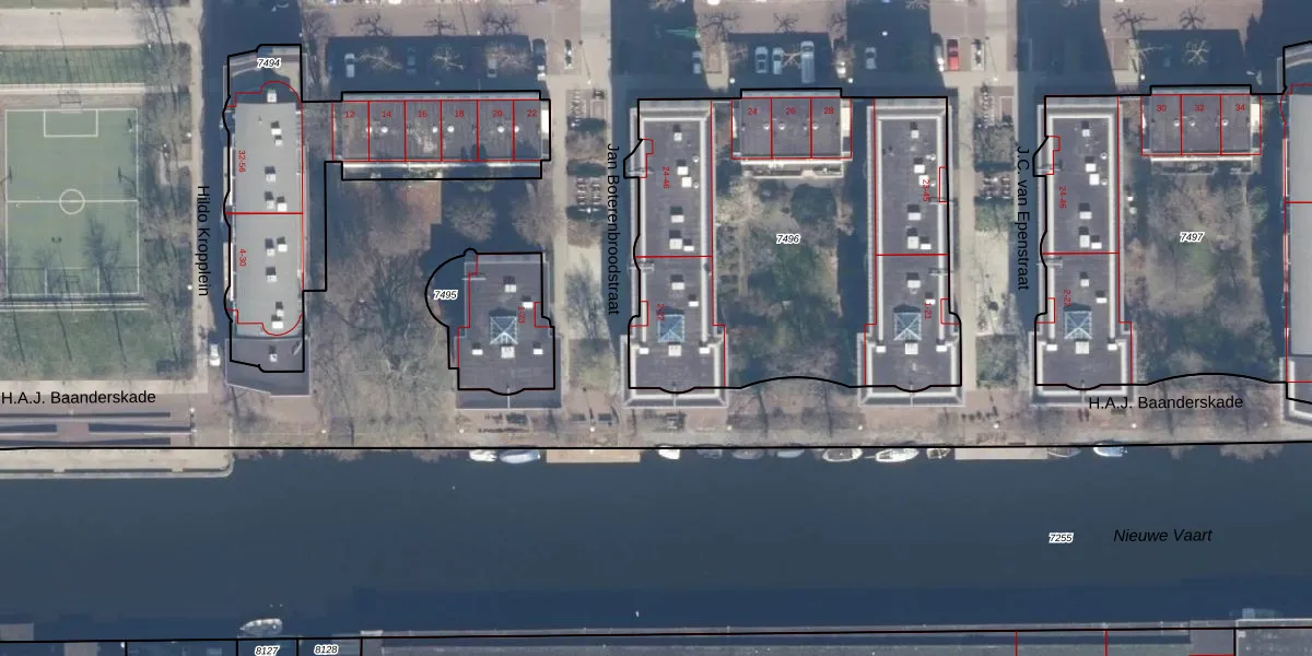 Jan Boterenbroodstraat 12 is gelegen op kadastraal perceel ASD02A7496. Deze kadastrale aanduiding is uniek en wordt gebruikt door het Kadaster om eigendomsrechten en andere zakelijke rechten vast te leggen. Het perceel maakt onderdeel uit van de kadastrale gemeente Amsterdam.