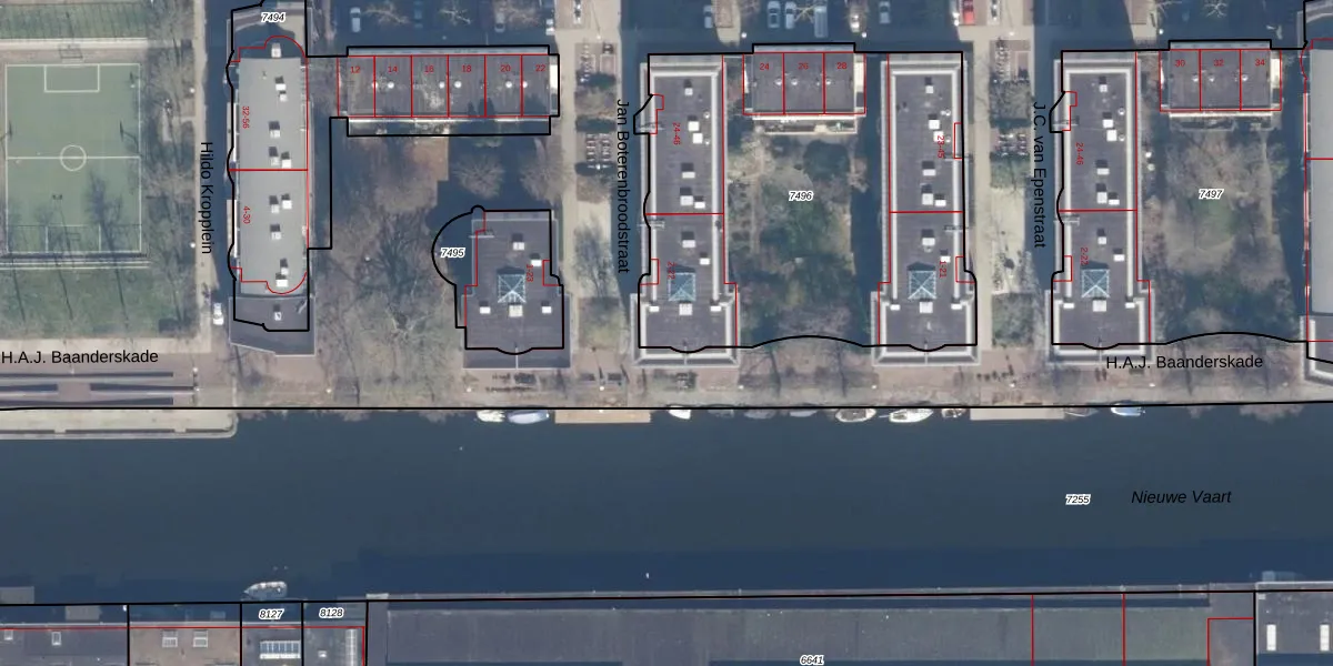 Het adres is gelegen op perceel 7496 in de sectie A en de kadastrale gemeente Amsterdam. De kadastrale aanduiding is aldus ASD02-A-7496. Het perceel is kleiner dan gemiddeld in Amsterdam. Het perceel is 2137 m² groot, terwijl het gemiddelde ligt op 2763,93 m². De grootste perceeloppervlakte in de kadastrale gemeente is 14,3 ha. De kleinste oppervlakte bedraagt 0 m². Op het perceel liggen in totaal 49 adressen. In de Basisregistratie Kadaster (BRK) werden de grenzen van het perceel geregistreerd op 24-10-2007.