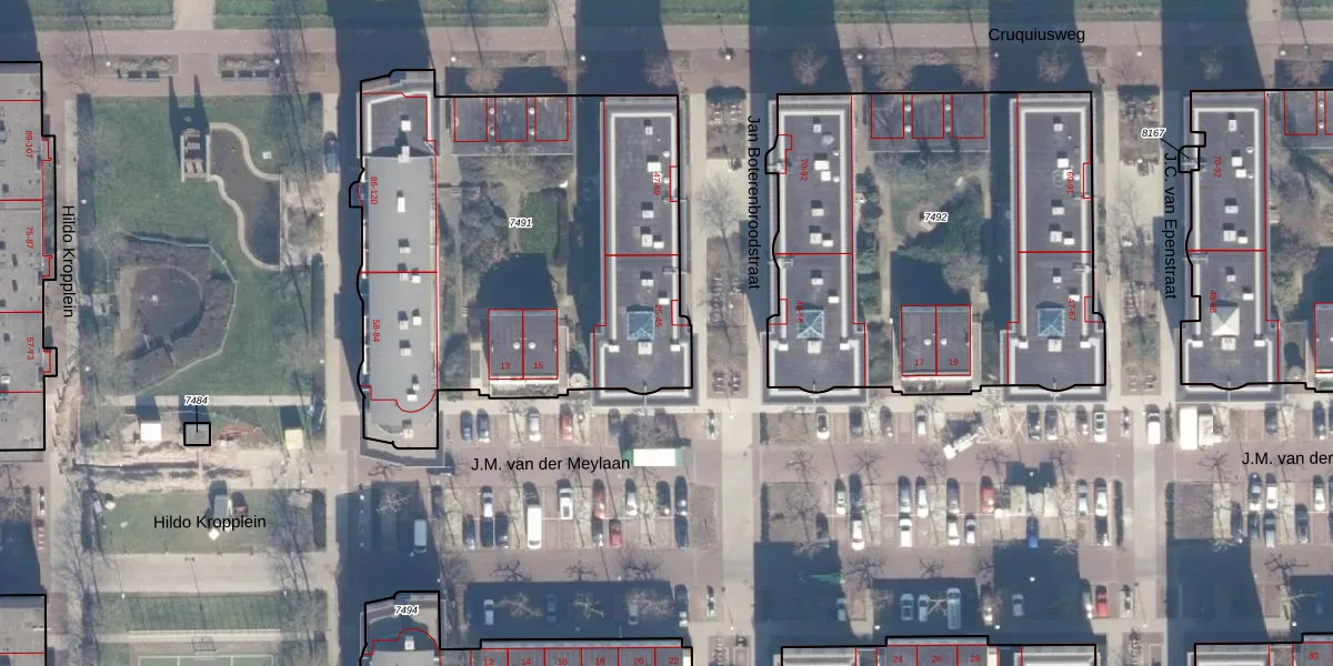 Jan Boterenbroodstraat 33 is gelegen op kadastraal perceel ASD02A7491. Deze kadastrale aanduiding is uniek en wordt gebruikt door het Kadaster om eigendomsrechten en andere zakelijke rechten vast te leggen. Het perceel maakt onderdeel uit van de kadastrale gemeente Amsterdam.
