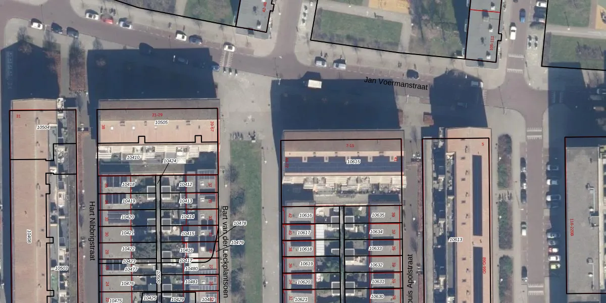 Het perceel waarop Jan Voermanstraat 15 staat heeft een oppervlakte van 870 m². Dit is een groot perceel. De perceeloppervlakte wordt geregistreerd door het Kadaster. Gedetailleerde informatie over de maten van dit perceel kunt u vinden in het rapport Kadastrale kaart met maatvoering van Jan Voermanstraat 15.