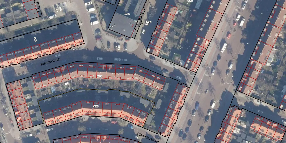 Het perceel waarop Jasmijnstraat 26-H staat heeft een oppervlakte van 3071 m². Dit is een zeer groot perceel. De perceeloppervlakte wordt geregistreerd door het Kadaster. Gedetailleerde informatie over de maten van dit perceel kunt u vinden in het rapport Kadastrale kaart met maatvoering van Jasmijnstraat 26-H.