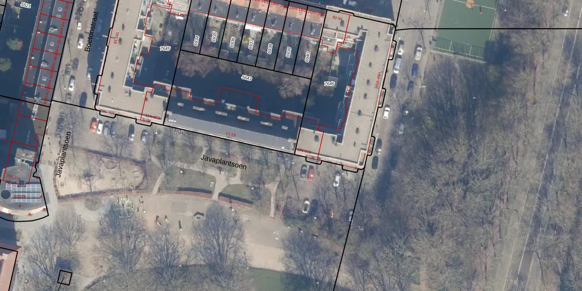 Javaplantsoen 19 is gelegen op kadastraal perceel ASD19W5643. Deze kadastrale aanduiding is uniek en wordt gebruikt door het Kadaster om eigendomsrechten en andere zakelijke rechten vast te leggen. Het perceel maakt onderdeel uit van de kadastrale gemeente Amsterdam.