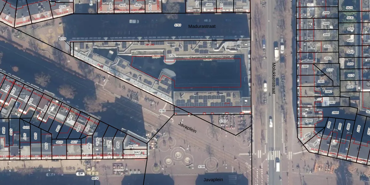 Het perceel waarop Javaplein 6-F staat heeft een oppervlakte van 2807 m². Dit is een zeer groot perceel. De perceeloppervlakte wordt geregistreerd door het Kadaster. Gedetailleerde informatie over de maten van dit perceel kunt u vinden in het rapport Kadastrale kaart met maatvoering van Javaplein 6-F.