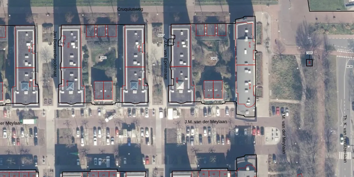 Het perceel waarop J.C. van Epenstraat 56 staat heeft een oppervlakte van 2278 m². Dit is een zeer groot perceel. De perceeloppervlakte wordt geregistreerd door het Kadaster. Gedetailleerde informatie over de maten van dit perceel kunt u vinden in het rapport Kadastrale kaart met maatvoering van J.C. van Epenstraat 56.